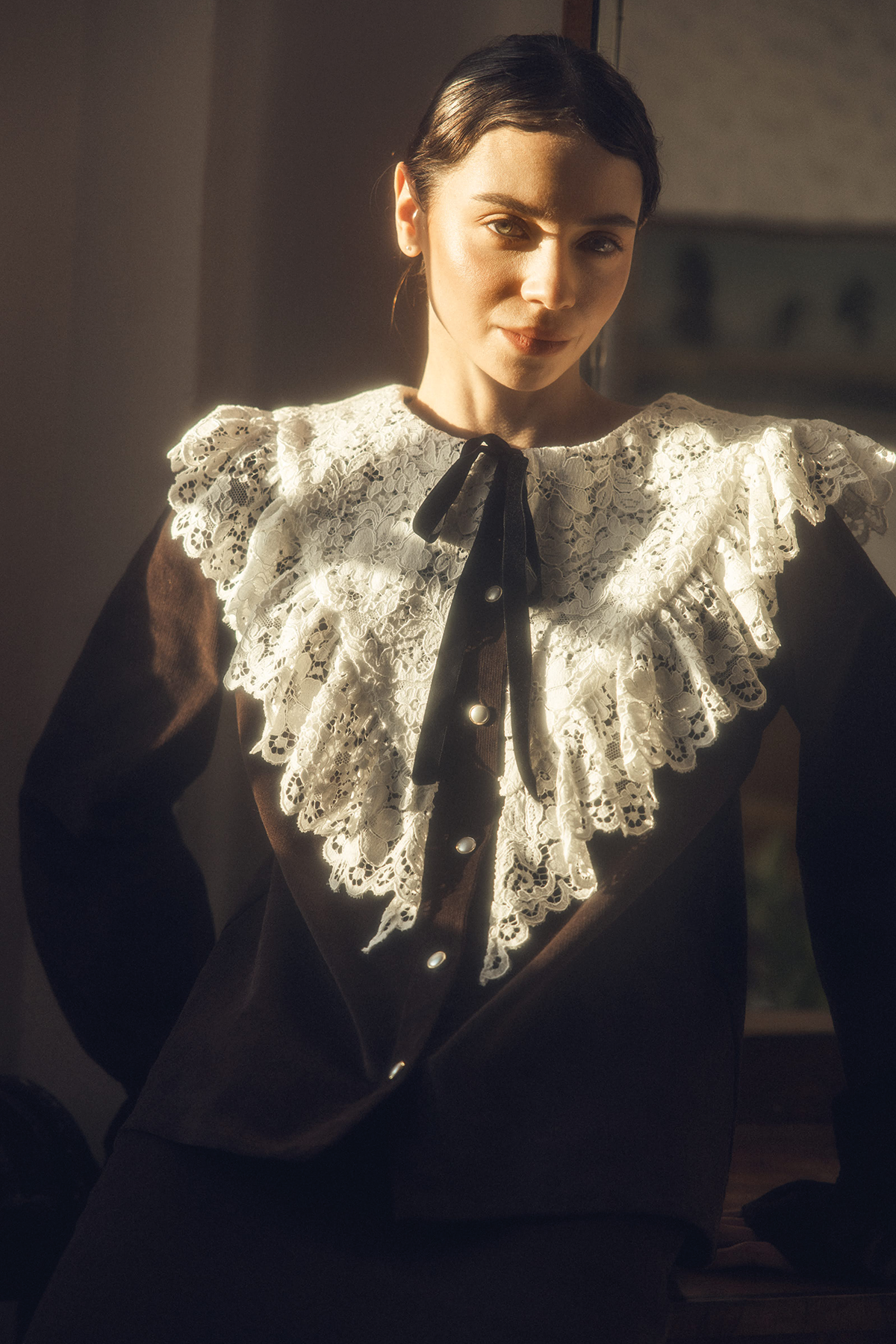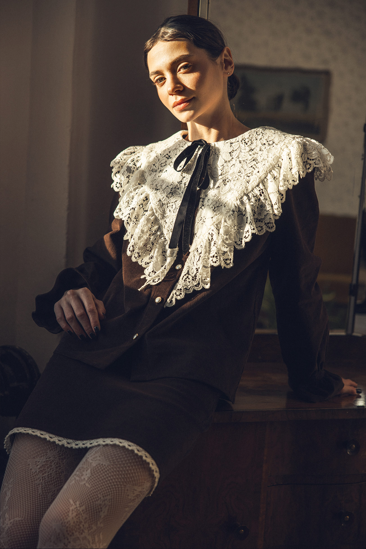 Czekoladowa koszula Helen to idealna propozycja dla fanek mody retro i vintage. Posiada luźny krój oraz ozdobne marszczenia na dole rękawów. Koszula ma charakterystyczny dla marki kształt kołnierza, zwieńczony aksamitnym wiązaniem, który sprawia, że prezentuje się niezwykle oryginalnie i dziewczęco. Została wykonana z drobnego sztruksu w intensywnym odcieniu brązu.