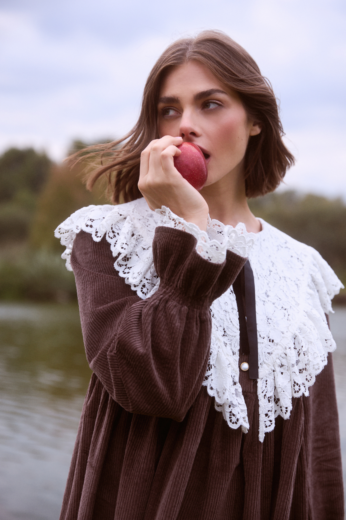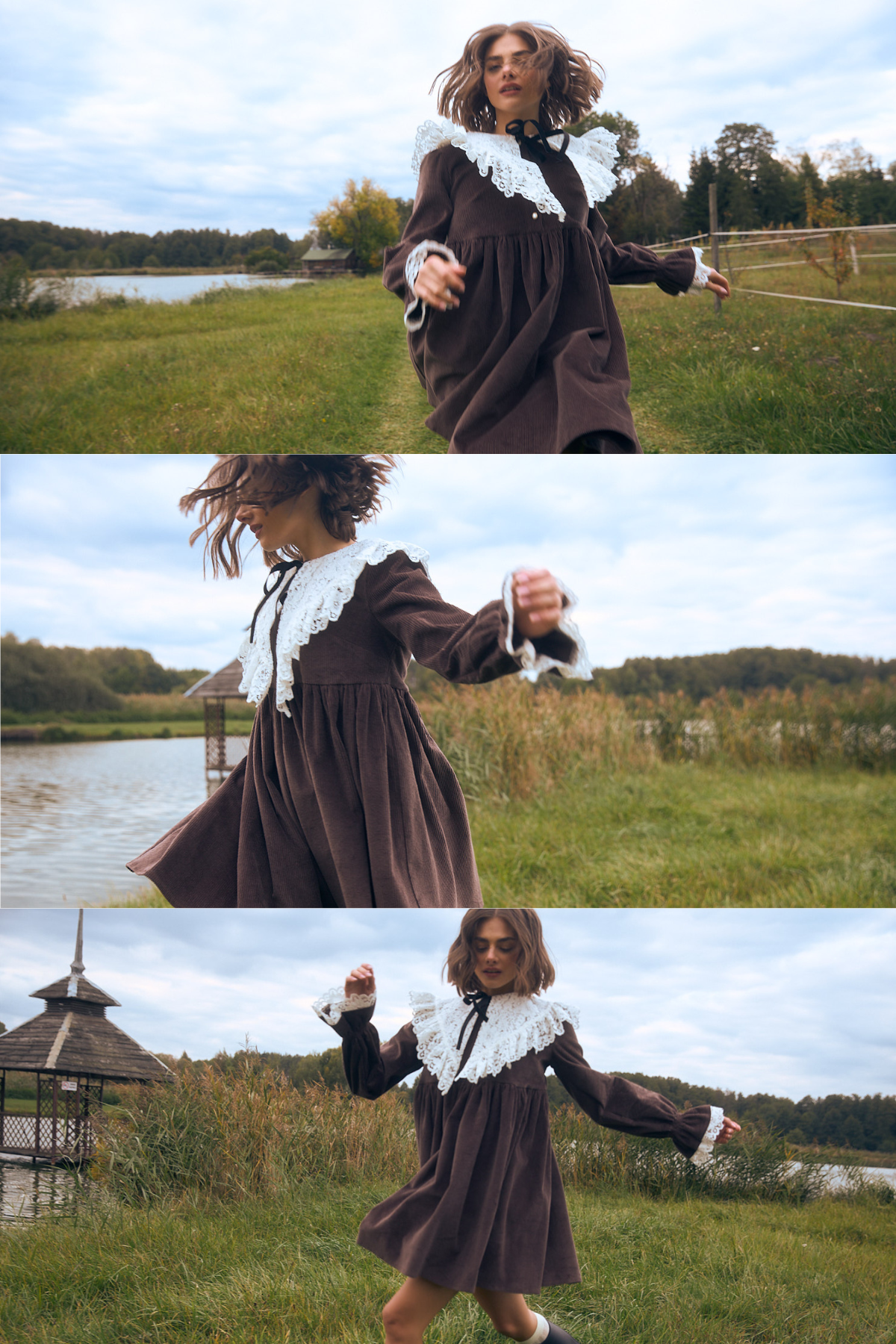 Czy jest coś piękniejszego niż połączenie czekolady z koronką? Brązowa sukienka DAYDREAM jest wyjątkowo dziewczęca i ciepła. Luźny krój zapewnia wygodę i komfort noszenia przez cały dzień. Rękawy wykończono koronką, a na froncie znajduje się ozdobna aksamitna kokarda. Model zapinany jest na dekoracyjne guziki. Całości charakteru dodają falbany, bufiaste rękawy oraz duży kołnierz, który podkreśli styl każdej stylizacji.