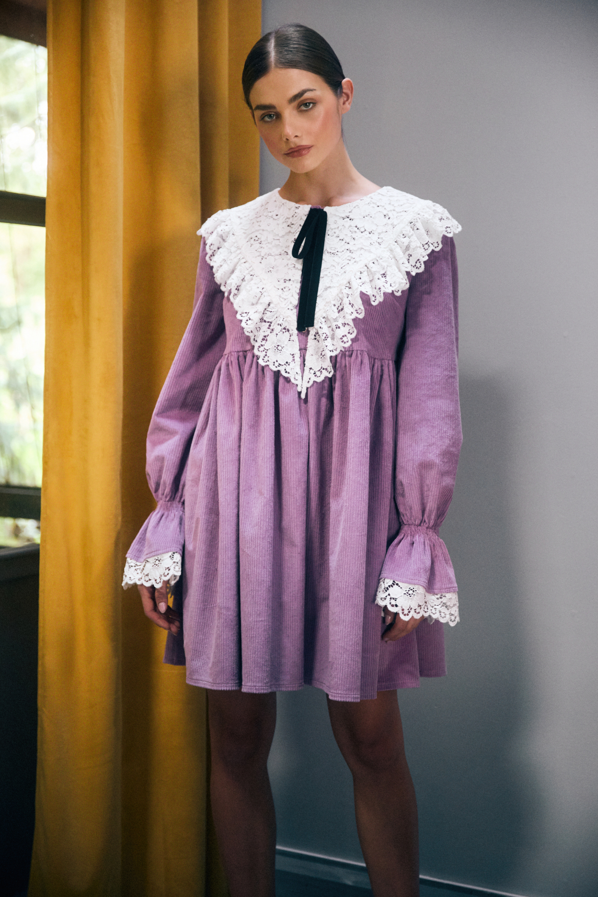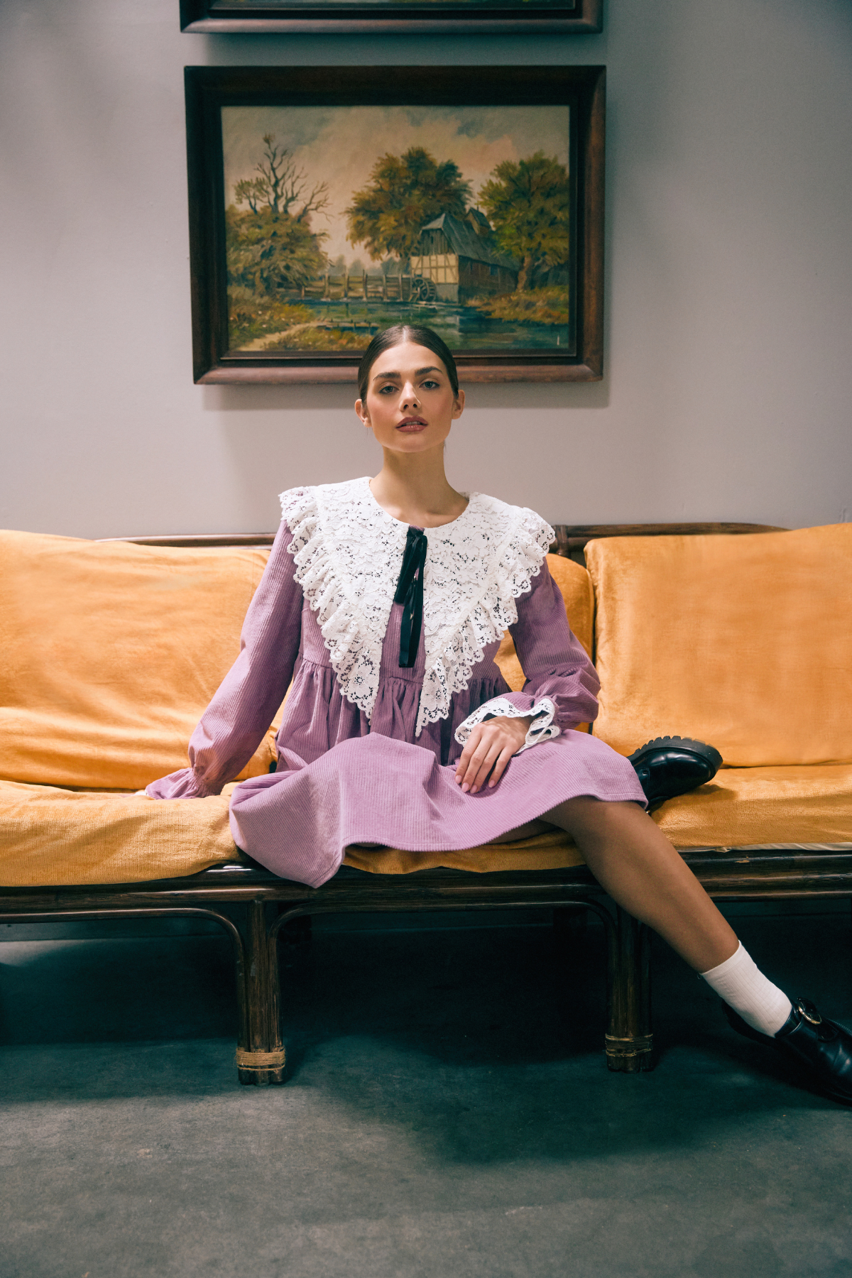 Sukienka Violet została wykonana z przyjemnego w dotyku sztruksu w pięknym liliowym kolorze. Zestawiona z delikatną koronką, tworzy wyjątkowo dziewczęcą propozycję na każdą okazję. Jej luźny krój zapewnia komfort przez cały dzień. Całość zwieńczają aksamitne wiązanie przy szyi oraz perłowe guziczki. Stylizuj jak lubisz – z botkami, kozakami czy mokasynami.