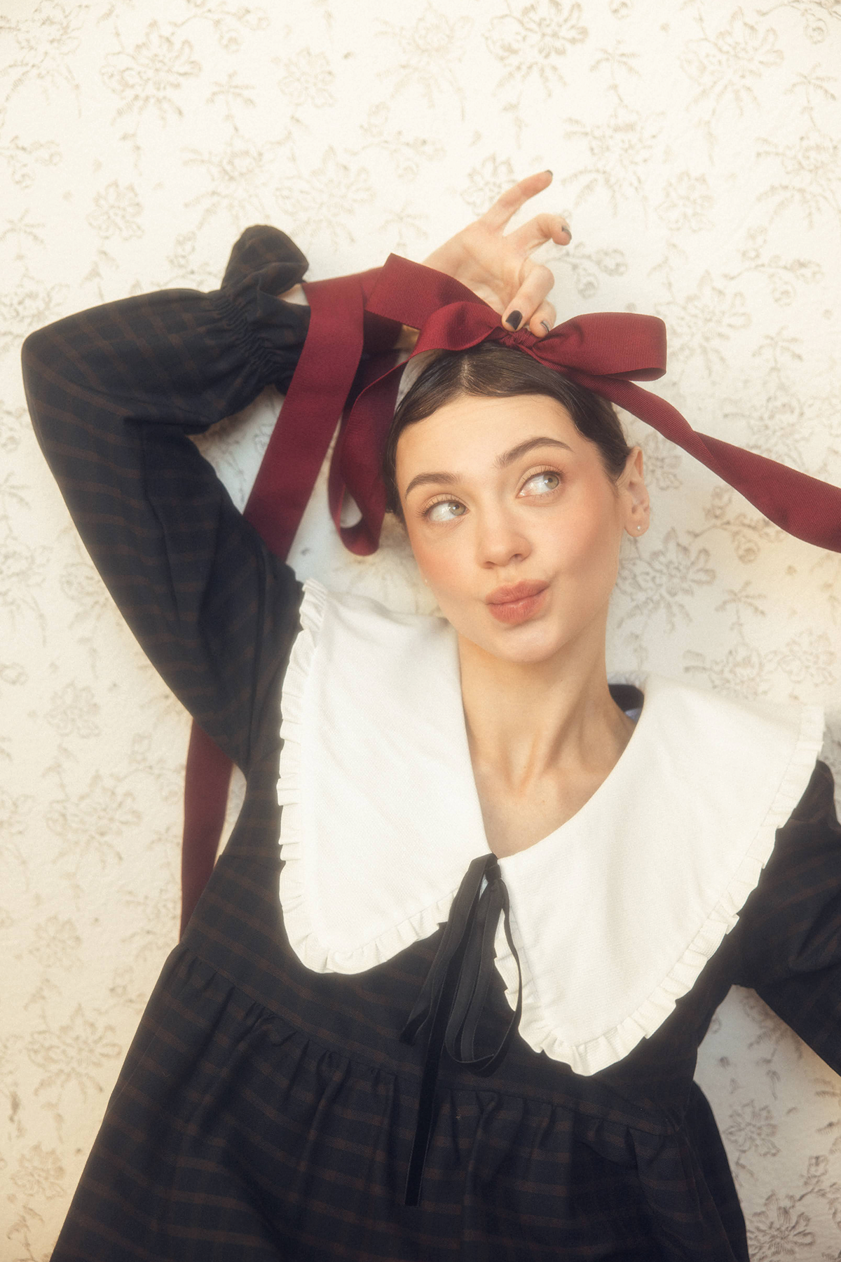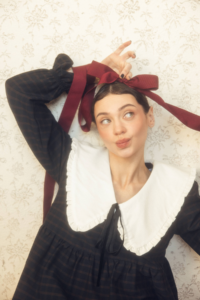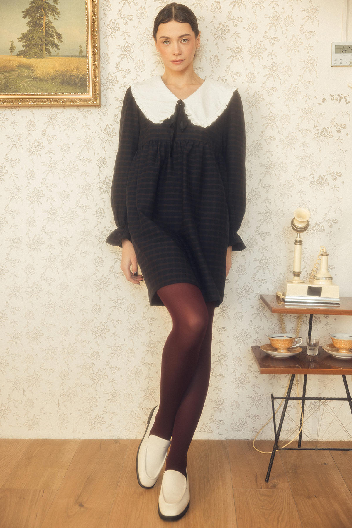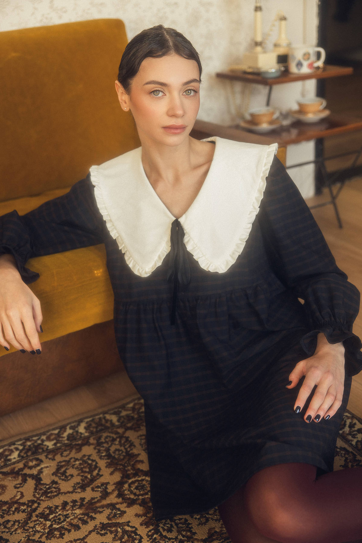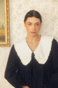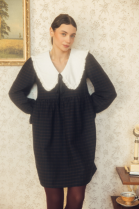 Mary to dziewczęca, romantyczna sukienka wykonana z miękkiej tkaniny w granatową kratkę. Posiada duży, biały kołnierz z delikatną falbanką, który nadaje sylwetce subtelności i charakteru vintage.