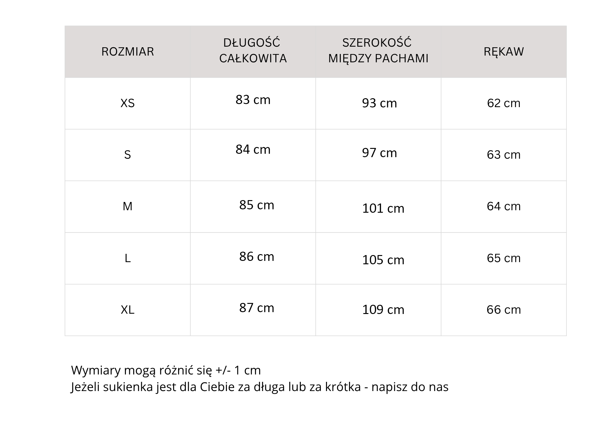 Sukienka posiada luźny krój – zalecamy sprawdzenie tabeli rozmiarów.